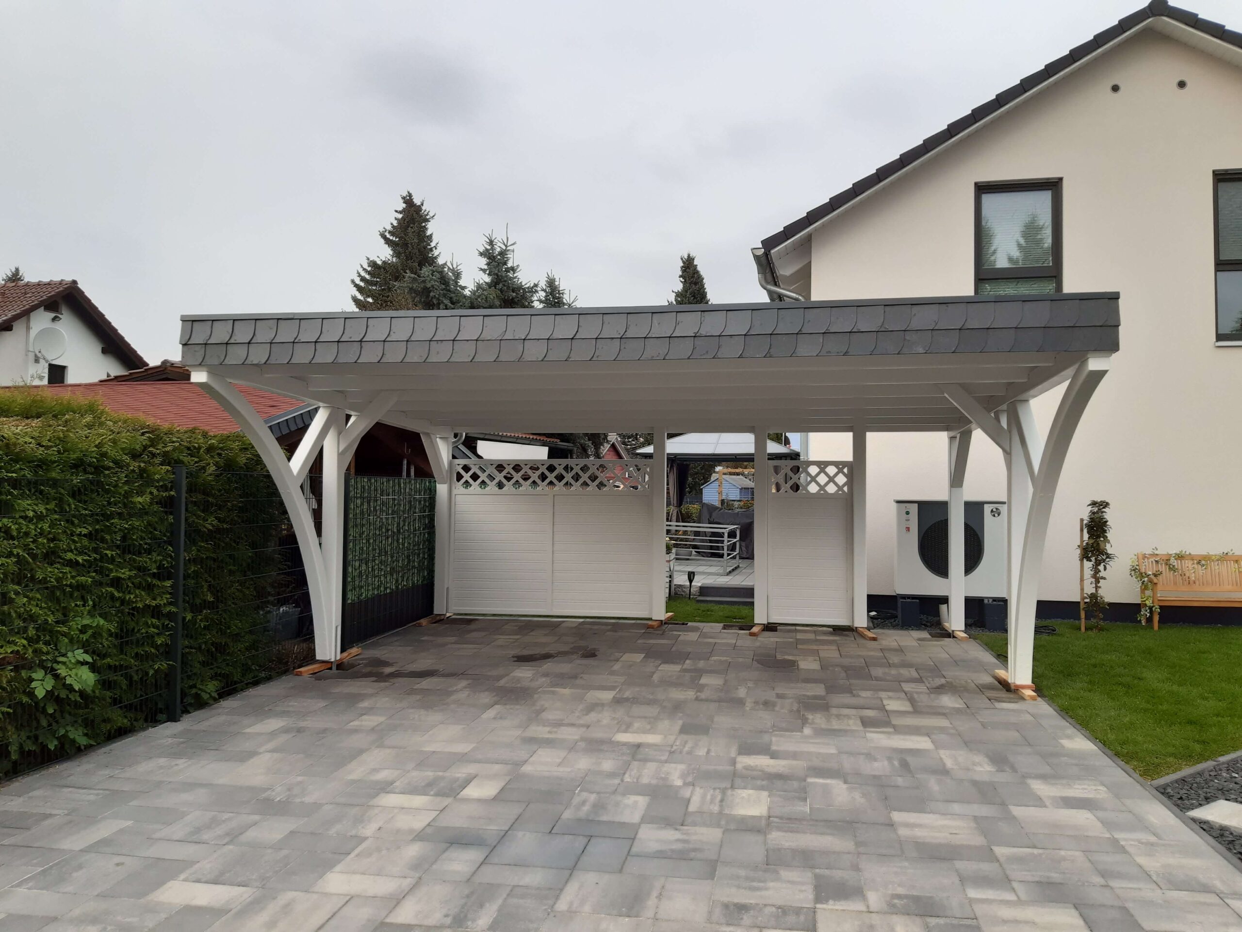 Doppelcarport in Deckfarbe Weiß mit dekorativen Füllfeldern