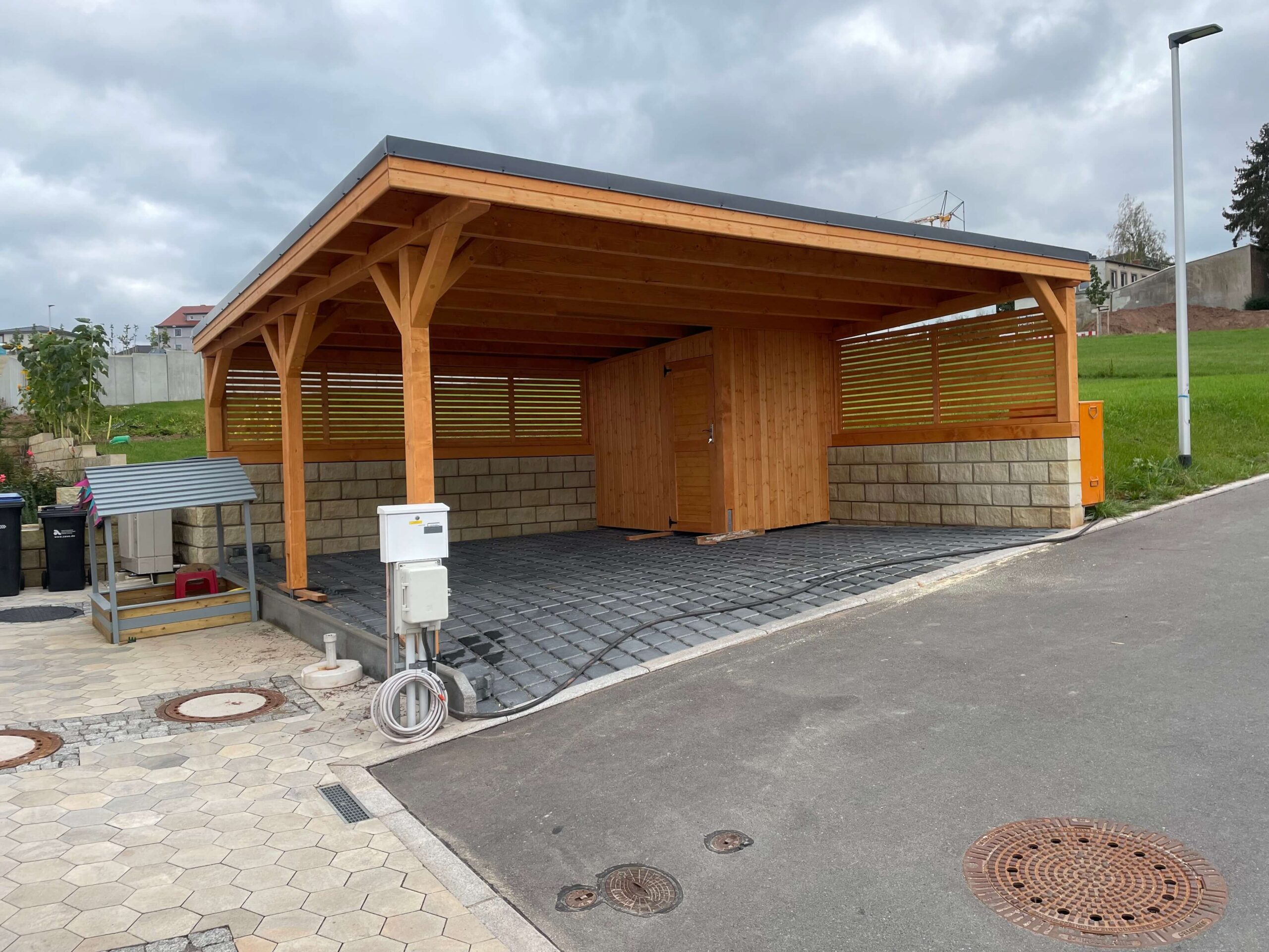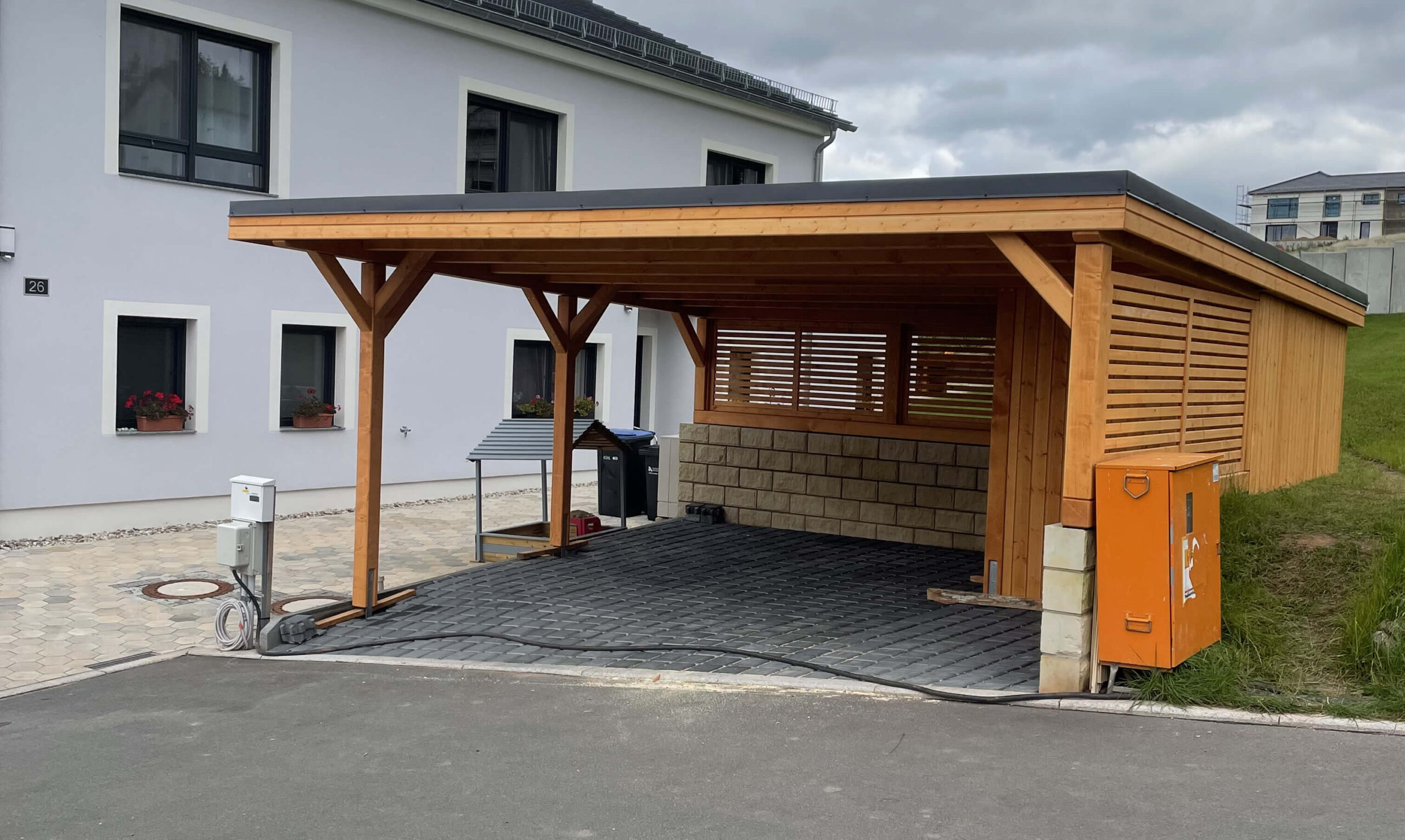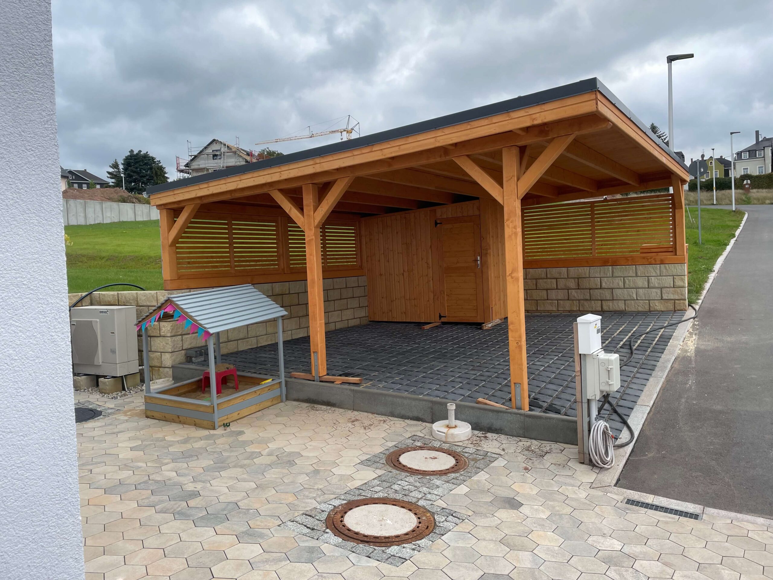 Ein großzügiger Carport mit Flachdach, integriertem Geräteraum und eleganten Lamellenwänden – konstruiert mit Blick auf Funktionalität und stabile Proportionen.