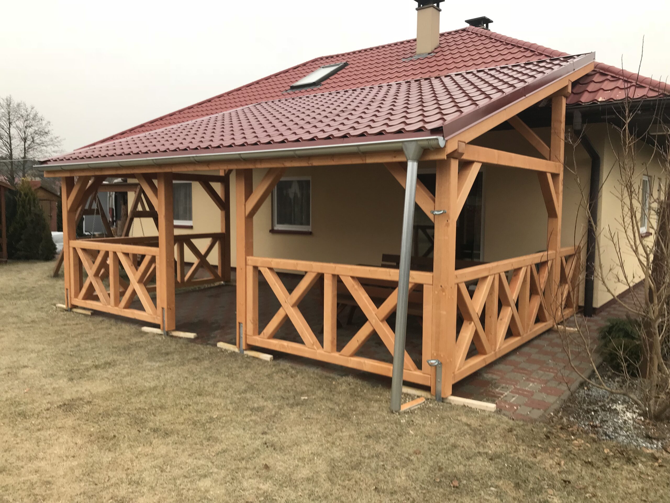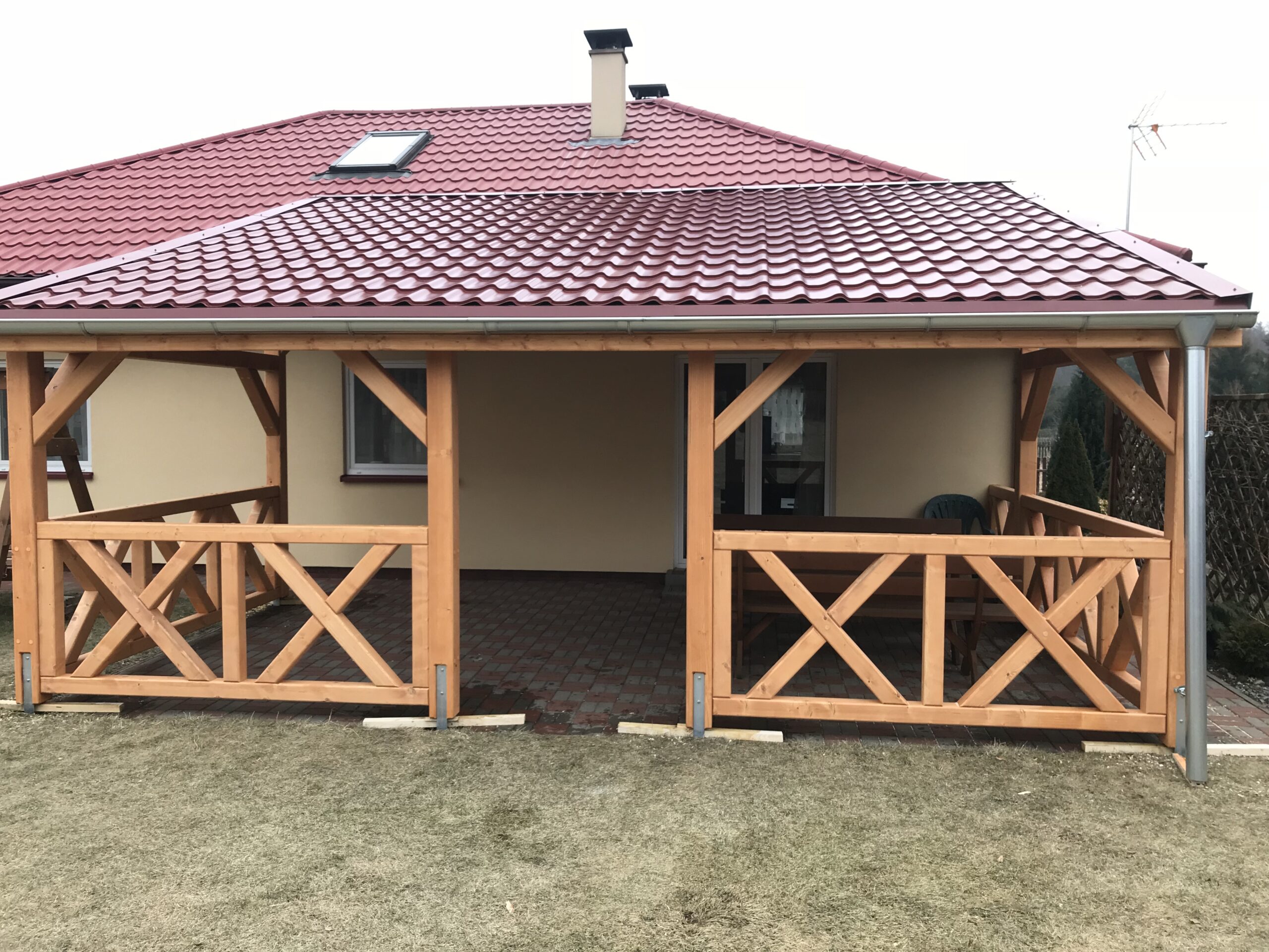 Handgefertigte Terrassenüberdachung mit Vivaldi-Blechdach und Kreuzgeländer