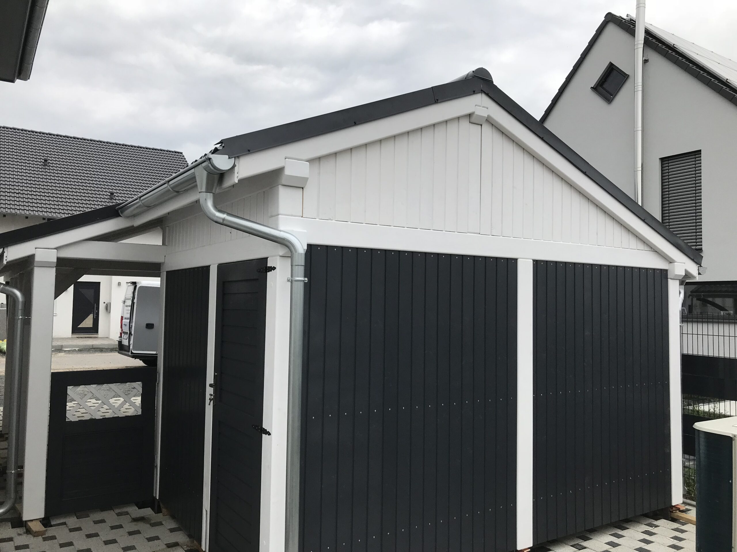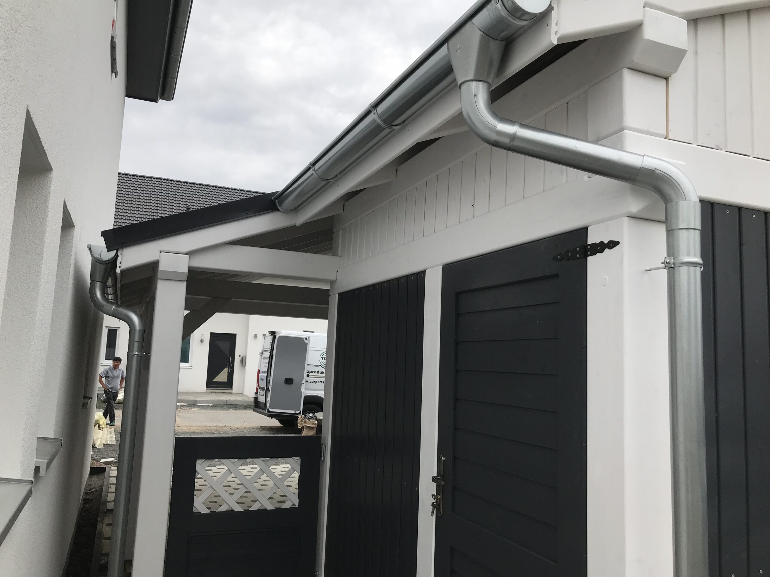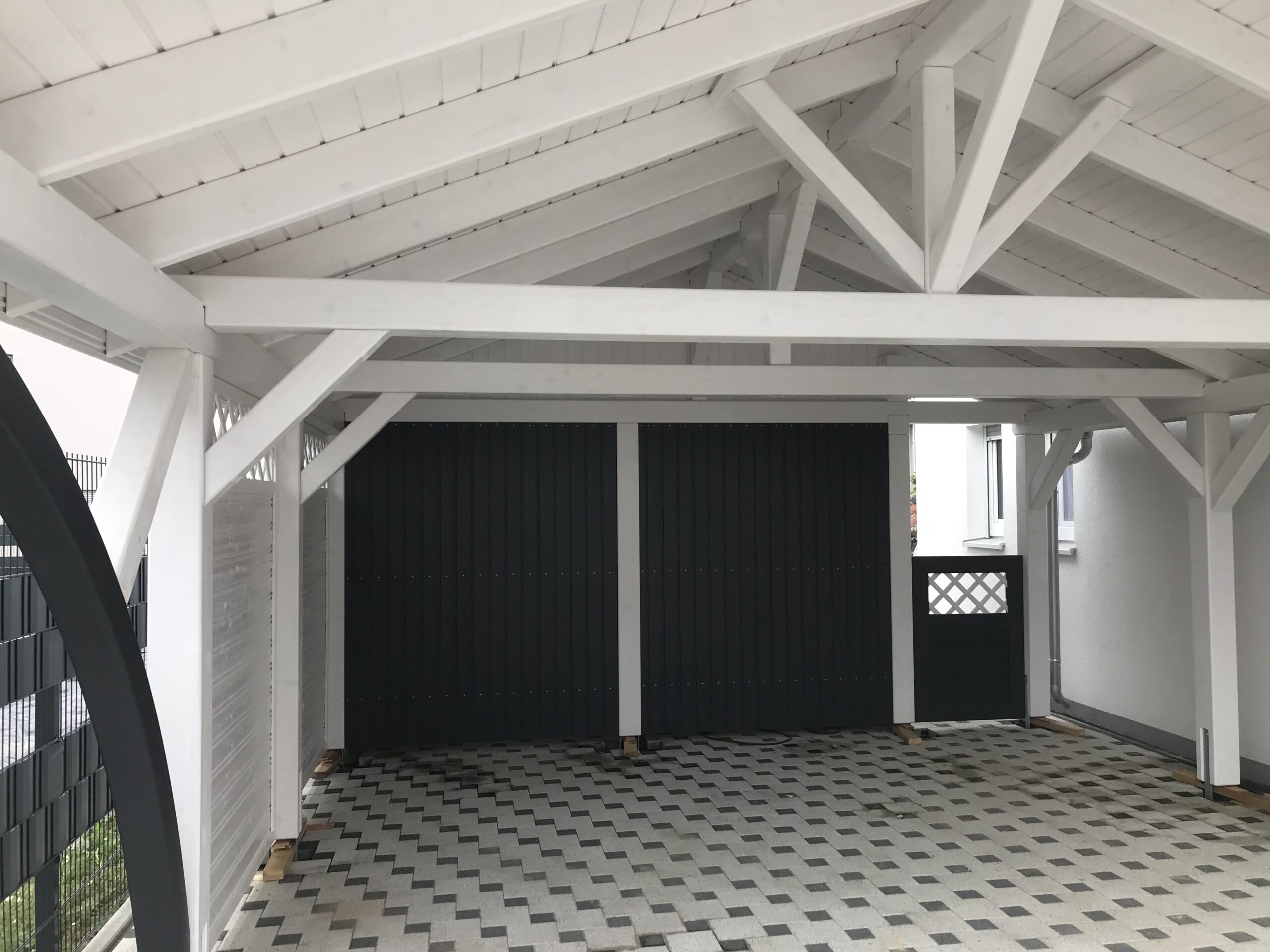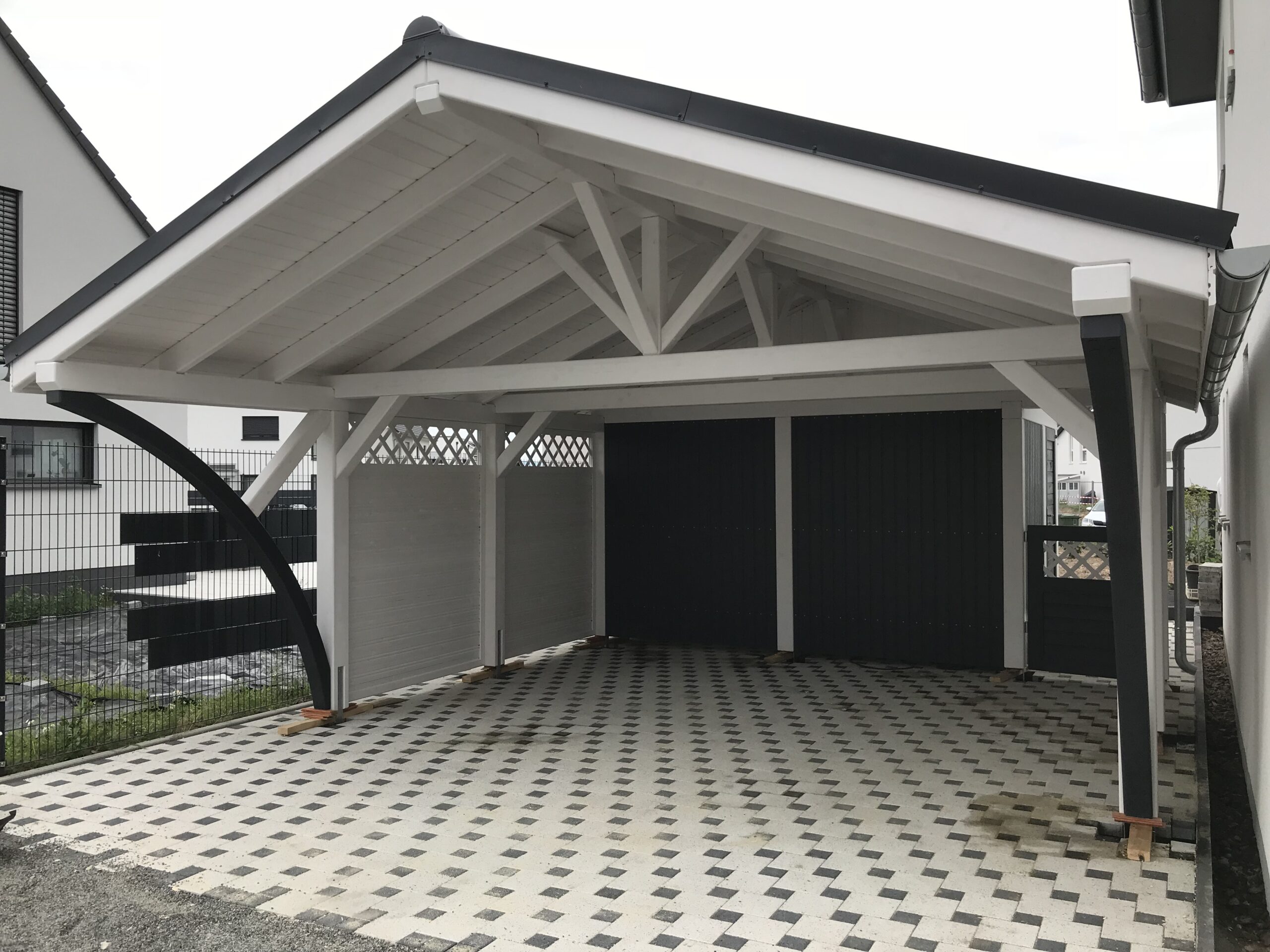 Ein klassisch-moderner Doppelcarport, der mit seiner klaren Farbgebung und präzisen Verarbeitung beeindruckt.